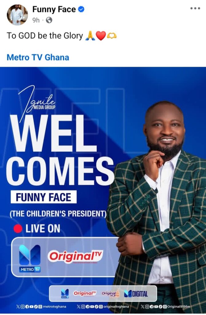 Popular Ghanaian comedian and actor Funny Face, widely known as The Children’s President, is officially making a major return to primetime television.