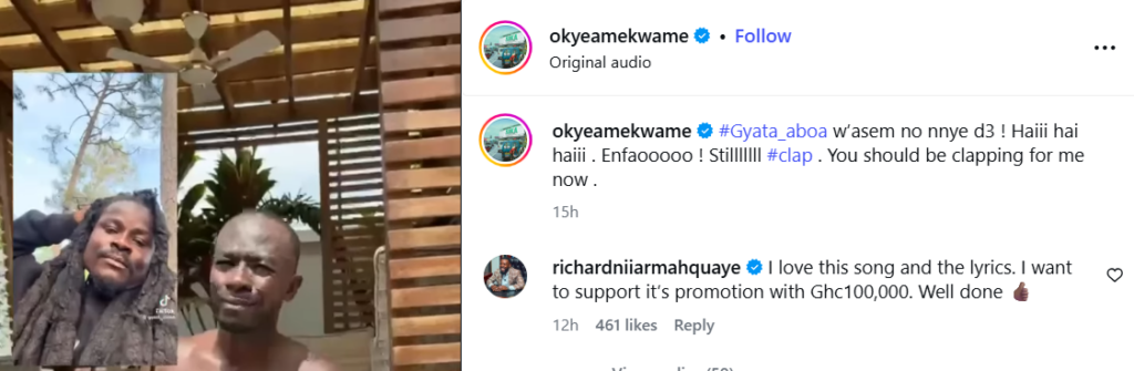 “Love this song and the lyrics. I want to support its promotion with GH¢100,000. Well done,” he said in a reaction video shared by the rapper.