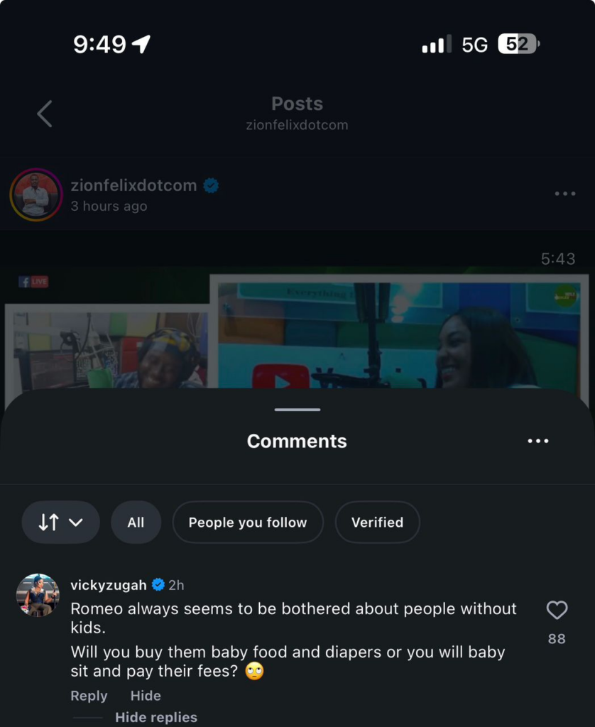 Zugah, weighing in on Instagram shortly after ZionFelix posted, appeared unimpressed with the recurring line of questioning. “Romeo always seems to be bothered about people without kids. Will you buy them baby food and diapers or you will baby sit and pay their fees? 🙄” she wrote, challenging the relevance of such expectations.